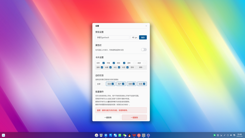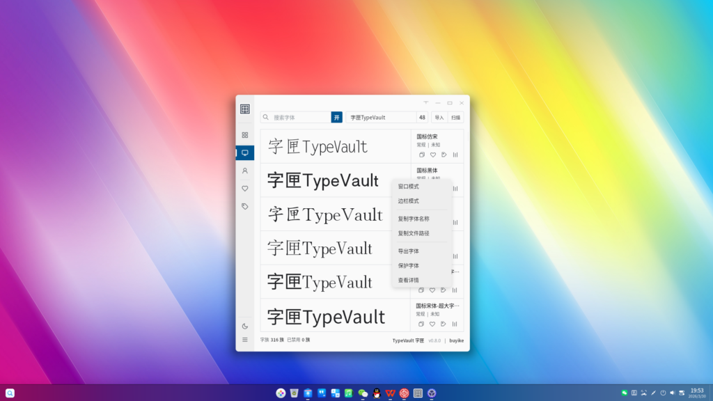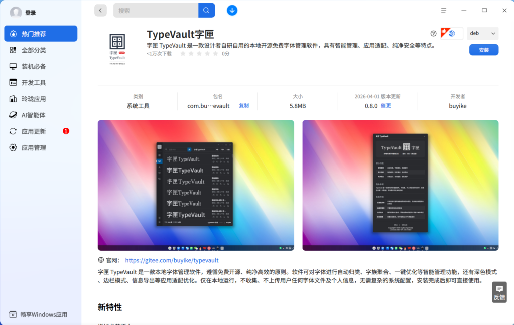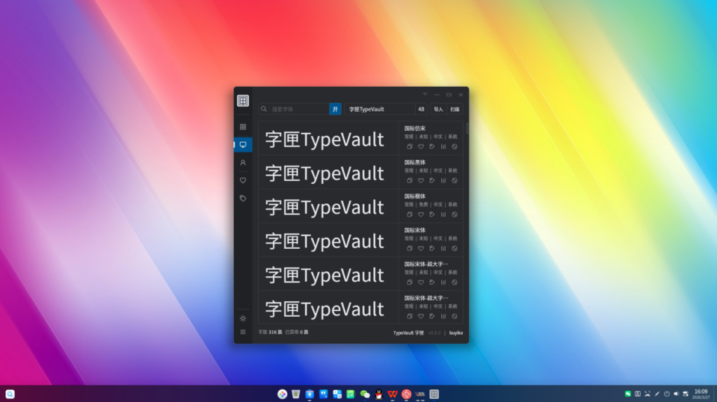 抱着 “自己痛点自己解决” 的想法,经过几个月的构思、测试与不断打磨,这款由自身需求出发、结合产品思维、AI 辅助与技术朋友建议共同完成的工具TypeVault 字匣,现已更新至 V0.8 稳定版本,并正式上架 deepin 应用商店,希望能真正帮大家解决字体管理的实际问题。