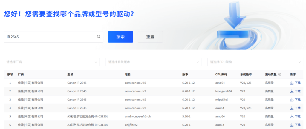 该平台当前所提供驱动已覆盖主流打印机品牌与机型,同时提供 AMD64、ARM64、LoongArch64 等多架构驱动包,一键即可下载驱动包和依赖包。若不确定该选哪个驱动,可通过关键词搜索快速定位目标驱动——输入打印机品牌或机型关键词,系统将自动定位目标驱动,还能按系统版本、CPU 架构精准筛选结果,驱动质量也具有直观标识。
