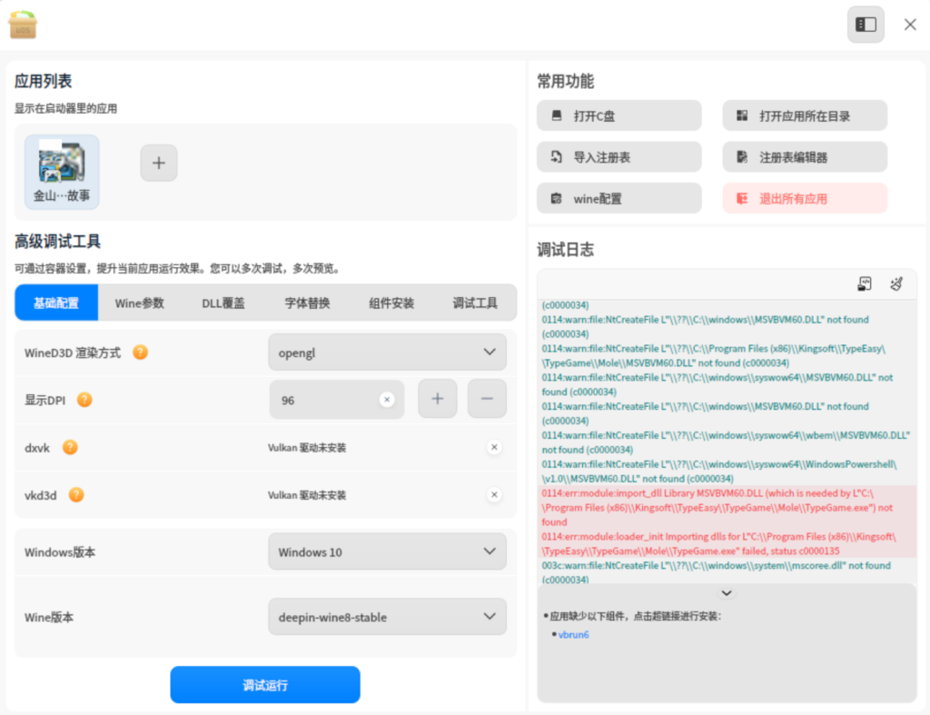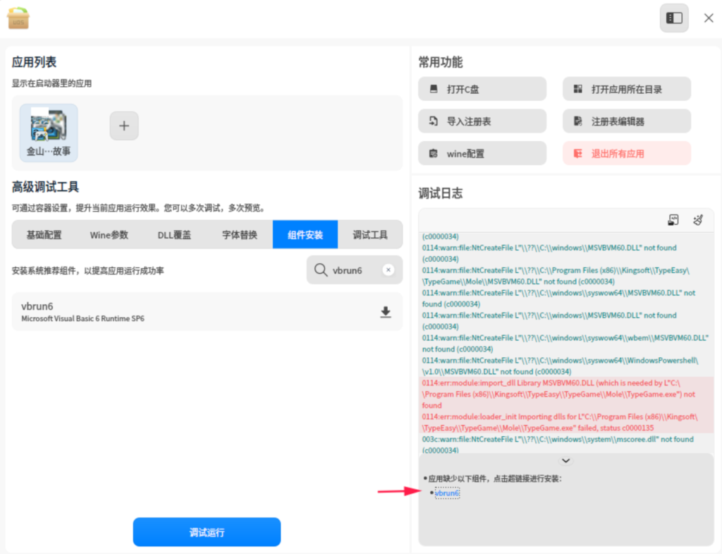 这通常是因为应用缺失某些动态链接库(DLL)。你可以进入该应用的高级调试页面,直接点击 “调试运行”,查看日志输出。
