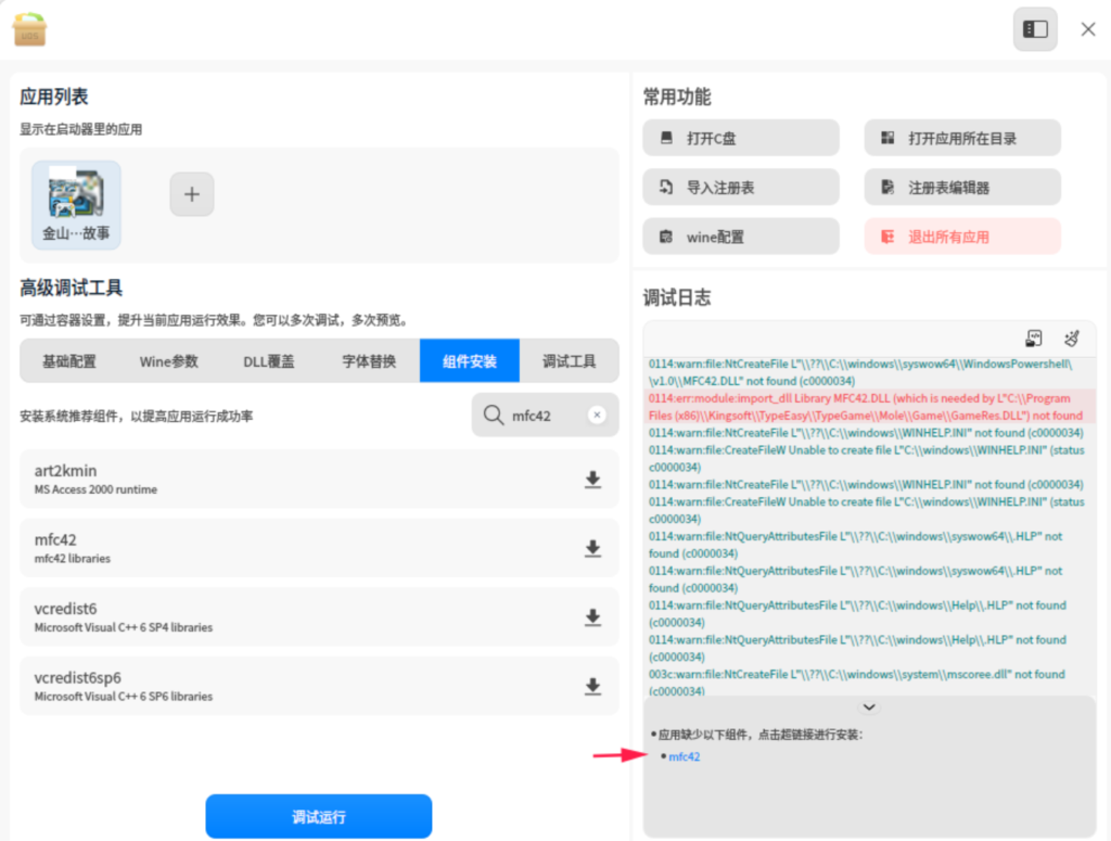 从日志中可以看到具体缺失的 DLL 名称。针对这类常见缺失,兼容引擎自 V3.2 开始在日志窗口中提供了修复建议文字链,点击即可跳转到 “组件安装” 模块,自动安装对应的 DLL 组件。