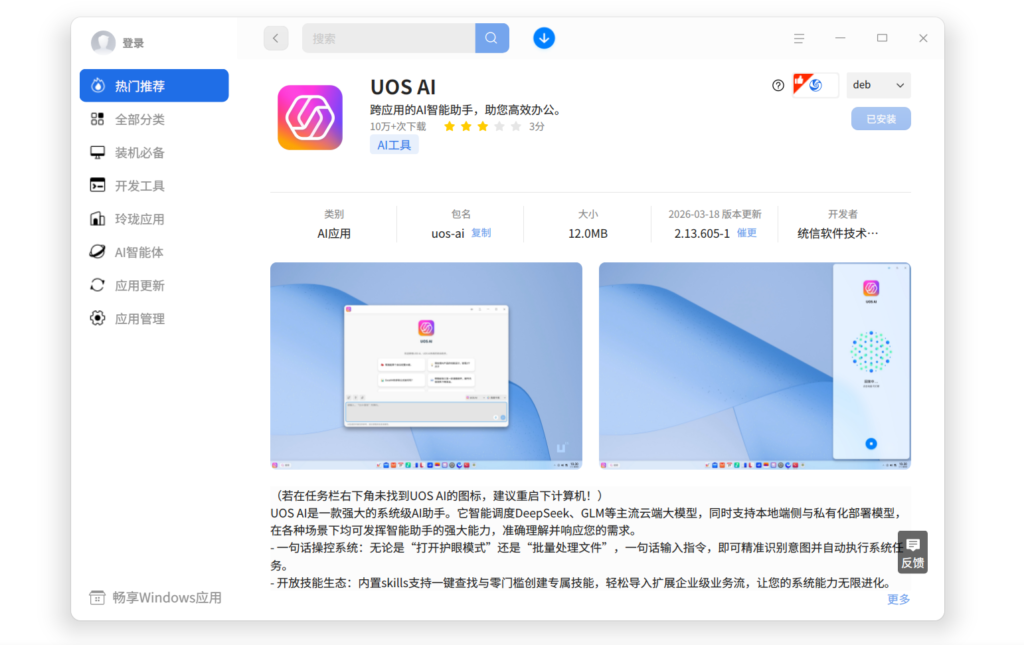 UOS AI:安装像个“精装房”。 作为底层深度适配的原生组件,UOS AI 早已为你铺好路。应用商店零门槛一键安装,上手即用,拎包入住。省去繁琐复杂的代码折腾,将宝贵的时间统统留给真正的创造。